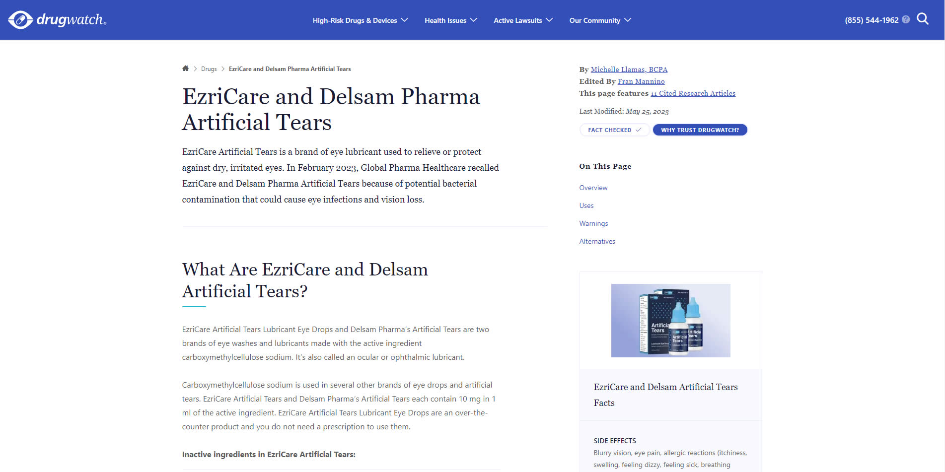 EzriCare Artificial Tears is a brand of eye lubricant used to relieve or protect against dry, irritated eyes. In February 2023, Global Pharma Healthcare recalled EzriCare and Delsam Pharma Artificial Tears because of potential bacterial contamination that could cause eye infections and vision loss.